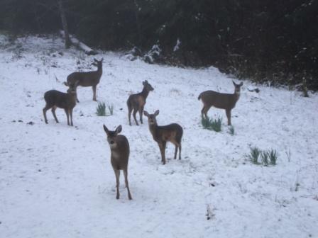 The local deer have appeared, hanging out in the front yard, nuzzling through the snow to try to find something to eat. Fortunately for us they do not appear to like the daffodils that are popping up through the snow. Six deer just walked up the driveway and are standing out in front of the house as though they expect us to come out with cookies and tea!