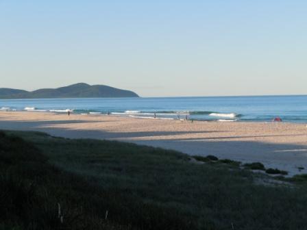 We made another quick stop at Bungwahl for a drink and then continued on Lakes Way until we reached today’s campground, called the Ruins in the Booti Booti National Park (Dave got a kick out of that, as you can imagine). The campground is located right next to Seven Mile Beach and is pretty full – lots of big tent setups with all kinds of rooms and covers. Our little tent looks a bit measly by comparison… but I’m not sure the extra room is worth the extra weight!