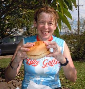 We got on the Pacific Highway about 4k or so from the campsite. The highway has a very wide shoulder, so while the traffic is a bit loud it is pretty good riding. It was pretty flat and because it is a major freeway any hills were very slight. We had to stop once for Dave to take a scenic break (smallest bladder in the universe, except at night!). We had some great riding until Dave tried to take a side road, thinking that it was a frontage road that would take us off the freeway for a bit. Unfortunately it did not – it ended at someone’s gated driveway! At that point Dave headed over the edge trying to get back down to the highway. As I tried to follow him down the very steep bank he stood down on the shoulder taking pictures instead of trying to help me – a few loud yells later he finally came up to help me down the last bit. I suggested that he not try to be so tricky next time and just stay on the XXXX freeway.