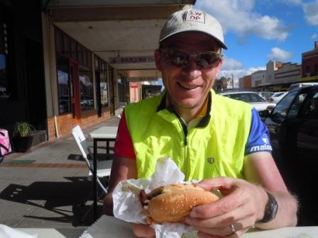 When we finally got to Glen Innes (15k later than we would have had we not done Dave’s diversion but who’s counting…) we went first to the tourist information center to see what the situation was for the long Easter/Anzac weekend. Glen Innes has lots of interesting things to see, given that it is the heart of the Celtic region in Australia. We have read a bit about it and were thinking of having a layover day here to see some of the more interesting sites, including the Australian Standing Stones, the national monument to Australian Celtic pioneers. It sounds like many things will be closed tomorrow for the holiday but most of what we want to see is really self-guided. Hmm, what to do? We followed our normal path and went to a local café and had an egg and bacon roll while we thought about it.