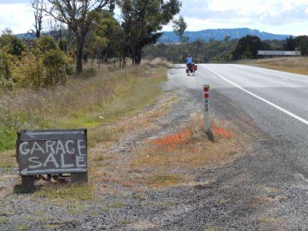 We were on the New England Highway for the whole ride today – good shoulder and not much traffic while we were out there. We had sunshine most of the way – though it got chilly quickly when the sun dipped behind a cloud. Pretty scenery continued from the last couple of days, but a bit more forested. I had my new flag on that was a gift from the neighbors in the caravan park so we were very visible. We held ourselves back from heading to a garage sale that was signposted on the highway – you could see for miles and there was no garage in sight.