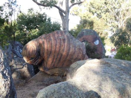 Eventually we found our way through town and the biggest caravan park we’ve every stayed in – “Top of the Town”. There are something like 10 shower stalls in the amenities block and the park is pretty full. We are near the apple picking season so we have holiday folks, plus some pickers. Most of the latter are young kids travelling. Makes us feel young hanging in the camp kitchen. Lots of birds in the park, plus some interesting “modified” rocks near our site.