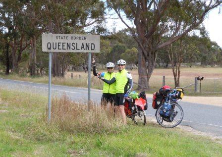 We had 24k to go, all on sealed roads. We stopped once to remove rain coats (again) and clean our glasses. Somehow, I left the camera on top of my bag as we took off.  100 meters later, it fell off. Nancy was behind me and did not run it over. We both held our breath as we tried to use it. Good news, it seems fine, dodged a bullet there. No guesses for the content of the lecture I received (all merited of course!) [editor’s note – it was not a lecture, just pointed out that in fact I was not a nervous Nelly for checking my bags regularly and that, see, it was important to check all bags before setting off]. Lucky the camera worked as a few k out of Stanthorpe we crossed our first state line – welcome to Queensland everyone!