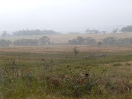 ANZAC day here in Australia. I heard the bugler and bagpipes from the tent at 5:45 – they started 15 minutes early with the dawn ceremony in town. Nancy somehow slept through it. Not to worry about getting up on time though as the birds were particularly active even before sun-up. We wanted an early start today to again get off the road early, but also because I convinced Nancy to take an alternative route today, off the highway. It was pretty cloudy in the morning but mist/rain held off while we packed and at brekkie.
