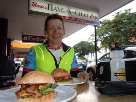 2. G’day Dave and Nancy. It was great to meet the both of you at Esk. I made it home by about 4pm today, so no more overnight stops for me. I traveled via Mapleton as I had planned and then took a left turn and rode to Kenilworth. What a great road. In celebration of our meeting I had a bacon and egg burger at the Top Cafe at Kenilworth!!! It was really nice too! LOL I even took a photo of it (with the motorbike in the background of course). Travel safely and hope to catch up again soon.