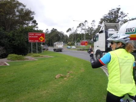 The road, the Warrego Hwy, was pretty wild. This is a major route between Toowoomba and Brisbane, so we waited until after 9 to leave to let the rush hour traffic get through. The first 10k or so was a massive downhill, coming off the range to the east. The sign at the beginning said 10%, with all kinds of warnings for trucks to use lower gears. The first little bit was under construction to reinforce the bank that had been undermined during the flooding, so it was down to one lane. Once two lanes opened back up we actually were going past trucks in the right lane as they were going very slow due to the slope – not sure I have ever done that on my road bike even!