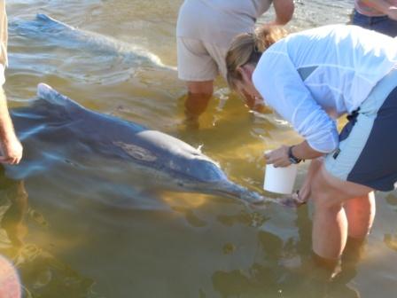 There were already a few folks waiting at the water’s edge, together with two ranger-types that were supervising the interaction with the dolphins. There was one dolphin swimming placidly around in the water right at the edge, and two others just a short ways out. Apparently in the 1950’s a badly injured dolphin was saved by local fishermen who fed it regularly at this spot while it recovered from its injuries. It continued to come into the area, and eventually its offspring came along with it – now the offspring of the offspring – the original dolphin’s grandoffspring – comes into feed, together with his mate and their offspring. The male is called Mystique and is 20 years old and is the alpha male of a pod of approximately 8 dolphins. His mate is Patch and is about 25 years old, and the juvenile is called Harmony and is 5 years old. Only these three of the pod come in to be fed – another couple of the pod come in a bit but do not feed, and the others of the pod stay further out in the channel.