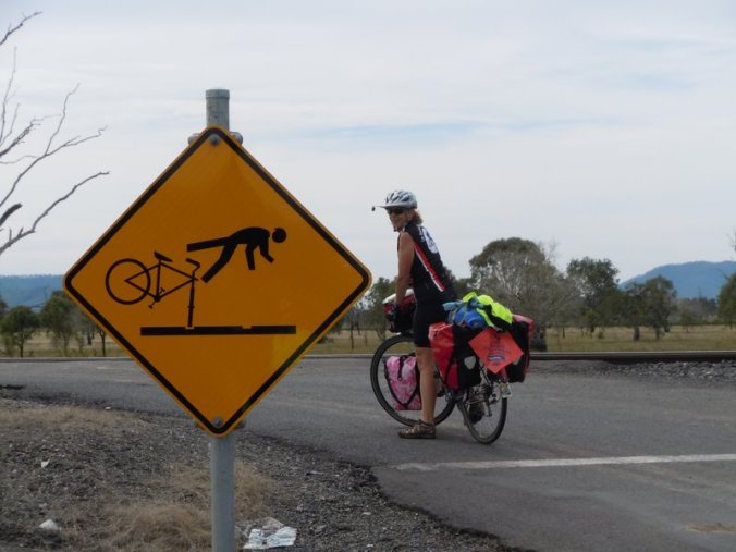 While we had a tailwind it was wearing being on the Bruce Hwy most of the day. We had to be vigilant about checking our mirrors all the time to make sure we were aware of traffic coming up behind us while also paying attention to the shoulder in front of us as it appeared, disappeared and reappeared over and over. Pretty wearing on the nerves. We finally got to a road Dave had found that appeared to go from the Bruce Highway right into Rockhampton and took it – Roope Road. It was a lovely quiet road – once you got by the deadly train tracks at the beginning of it. It went through farmland, over the Roope River with lovely water lilies everywhere. It was quite flat so I am sure it would flood easily if it rained much. It was so nice not to have to be on guard all the time for cars and other obstacles.