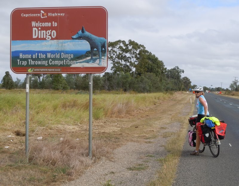 We tried to avoid yesterday’s mistake of not eating enough so stopped for morning tea at a roadhouse in the town of Dingo, about 37k into the day. Dave came out with a meat pie and a big litre of flavoured milk – it actually tasted pretty good! Dingo is, not surprisingly, named after the native Australian dog. It is home to the annual World Dingo Trap Throwing Competition – unfortunately it was not on when we passed through.