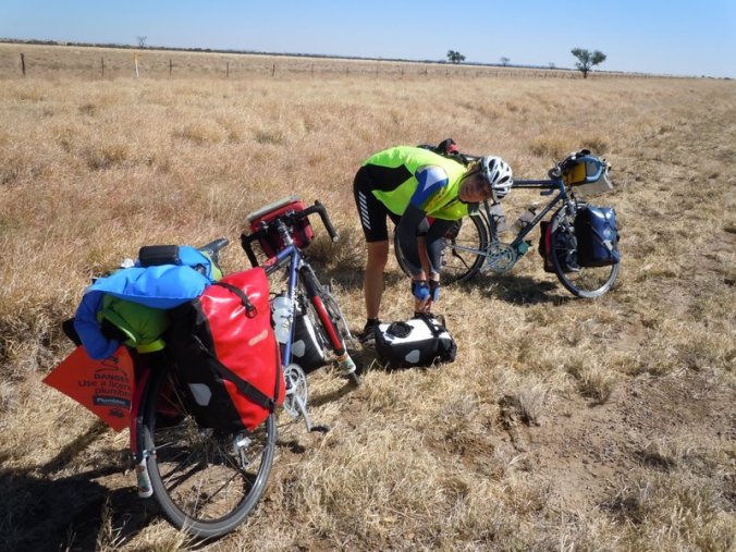 There were no towns at all today. We stopped for morning tea and lunch at road side rest areas. Both rest areas had water tanks that had no warnings not to drink. We carried about 15 litres with us at the start of the day but probably could have had less. The last rest stop, 45k from Winton, where there was supposed to be water had a couple signs saying not to drink, validating our choice to carry water. We would have been out of water by then if we had not had our extra supply. We had one on-road repair after Nancy’s front pannier popped the screw so the hook that goes over the rack separated from the rack. Thankfully the screw was still there so it was an easy fix.