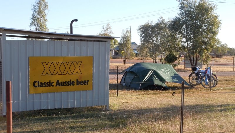 Sorry this post is coming at least a day after it was written. This is the second town/night in a row where we have no mobile signal. There are lots of trucks here and like last night, there is a Telstra phone booth in clear view of our tent sight. But still there is no mobile signal. We’ve seen some of the truckies using satellite phones. Not sure what folks do for internet. It would be really hard to live here, very isolated and long ways from Kynuna, which itself is small and a long ways from nowhere.