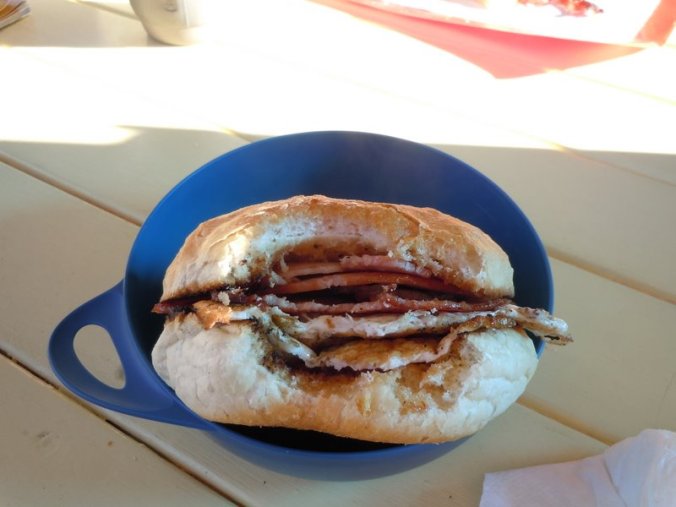 So, while I am running back and forth getting the rolls cut and the coffee prepared (we get two pots of our little espresso on rest days, one for each cup) Dave cooks up the bacon first, getting the grill the right temperature with a bit of bacon fat so that the eggs can cook without sticking. If there is no grill (bad camp kitchen) we use our little frying pan – this requires a lot more coordination but is possible.