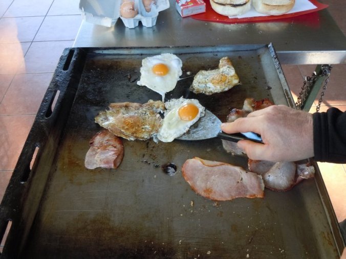 Anyway, the cooking usually comes together all at the same time, and assuming I have done my job getting the other bits ready the production stage commences where all the bits go on the rolls. First the top and bottom of the roll is buttered (while warm so the butter melts), then BBQ goes on top and bottom. Then Dave gently puts the eggs on and then puts the bacon on top and then the top half of the roll goes on and, wa la, you have a delicious egg and bacon roll that should fuel your activities for a few hours!