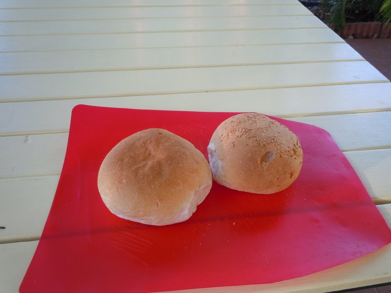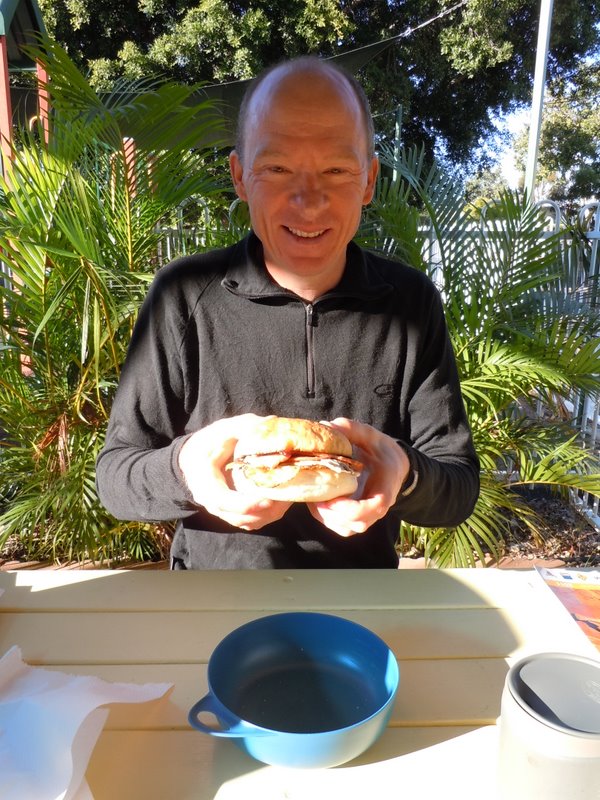 We generally only make our own egg and bacon rolls on days when we are at a caravan park and have access to a camp kitchen – it’s too hard to do otherwise. Dave is usually the chef, as preparing them usually involves the BBQ and lots of splattering. I try to take care of the roll preparation and getting the coffee made so that it is ready to drink when we sit down to eat. A nice cup of espresso always adds to the pleasure of eating an egg and bacon roll. During rest days we get real milk in our coffee, which is lovely after having powered milk in it while we are on the road. It’s the little things in life that make a difference. Who needs a house, a car, or even a bed when you can get real milk for your coffee… 😉