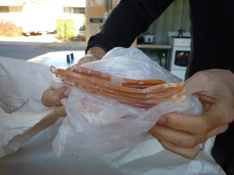So, here is how we make our own egg and bacon rolls (we don’t do burgers, though we probably should put tomatoes and lettuce on to get more veggies). The first thing is to make sure you get the right bacon. In Australia they sell bacon referred to as ‘short cut bacon’. It is generally the bigger piece of bacon with out the stringy fat bits that you get on normal bacon. It is often thicker than normal bacon as well, so you really get the meat of the bacon and the flavour. You often have to go to the butcher to get this type of bacon though they sometimes have it at the big grocery stores. For those in the States this is most similar to what we used to call Canadian bacon. See the pictures below for the difference between regular bacon (at the top of the picture) and short cut bacon (at the bottom of the picture).