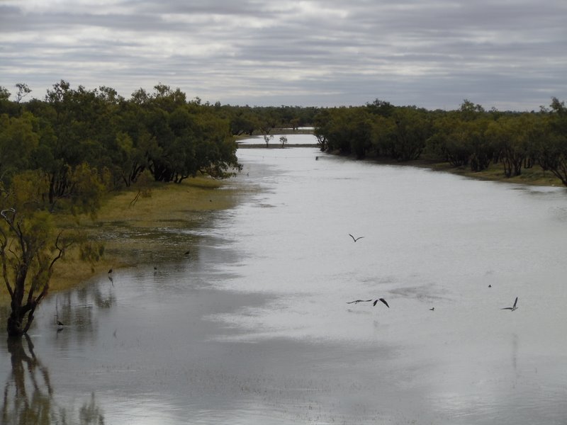 We had steak sandwiches at the pub – not bad. After eating we walked around a bit and took some pictures, and walked over the large bridge on the west side of town to look at the river and billabong near town. Caravanners can camp down there for free but there is no water so not a good solution for us. It was quite picturesque though and there is quite a bit of water in the river.