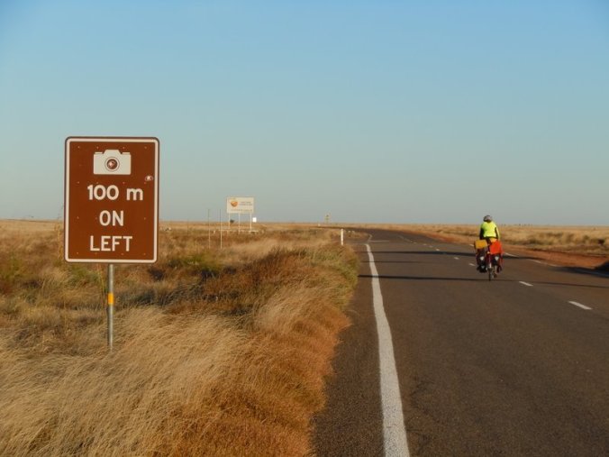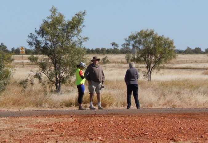 The roads were pretty deserted – it was more than an hour before we saw our first car. As far as you could see it was grassland – very few trees. There was about a 25kmh wind from the south, and you guessed it we had to veer south a bit. Arrgh – a tortuous ride to the first rest stop at Avon Downs. We had to stop multiple times to fix the *!#*! bags as the strapping over the water bags was not working. Not fun in the cold wind.