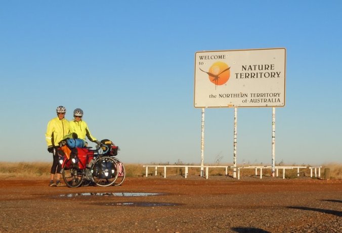 It was very cold and windy when we left – we were wearing our raincoats for warmth and our wool gloves. The wind was a very strong crosswind – not very pleasant in the cold. The Northern Territory border is 13k from Camooweal so we stopped to take a picture of the border crossing into our third state – well, I guess that isn’t really right as NT is not a state but a territory. So, we stopped to take a picture of the border crossing into our first territory! NT is ½ hour behind Queensland but we didn’t pause to change our watches as we wouldn’t be anywhere it would matter.