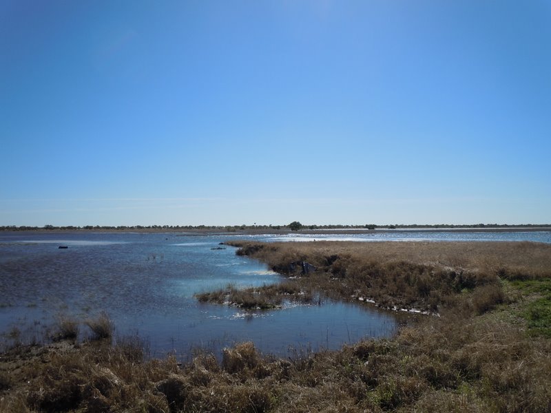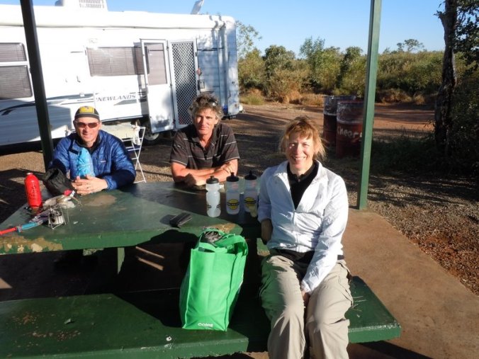 We hit the road with Steve about 8:30 and had a pretty good tailwind for the first 55k, where we stopped for morning tea. Very little traffic – it is a public holiday today but not sure there is ever a lot of traffic on this road. We stopped at a roadside rest area that had gotten a lot of rain over the Christmas period and there was quite a bit of water – a little lake really. One of the other caravanners parked said that he had been there 2 years ago and that it was dry as a bone. Apparently the road had been cut off from all of the flooding. Anyway, it was a nice sight to see out in the Outback. We ate our muffins that we had picked up at the roadhouse while Steve made his usual cup (or two) of espresso.