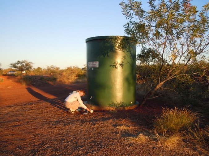 We ate our lunches (PB&J again for us, Steve heated up a can of beans and ate them over a roll) and then set up our tents. A bit hard in the wind but we finally got it up. There is a water tank here with the usual sign that says ‘Water may not be suitable for drinking’. We used the water to have a sponge bath (discretely tucked into the bushes) – felt nice though it was cold. More and more caravans came into the area, which is quite large – feels like a big crowd here tonight. Lots of people come by and want to chat about cycling, where we have been and where we are headed. Nancy always tries to get more information about the road ahead and good places to see. Some will chat for ages if you let them.