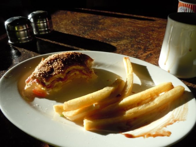 We planned to have breakfast at the roadhouse as we saw on the menu last night that they served pancakes. So, we packed everything up, got our extra water for tonight’s bush camp and then headed over to the restaurant with the bikes. Unfortunately it turns out that they no longer serve pancakes – quite disappointing! So, we had the usual egg and bacon roll, which came out with a side of chips! Ah, breakfast of champions. It was warm and filling so met the basic needs – but we were really looking forward to pancakes.