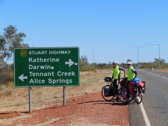 We debated for some time what to do next. Tennant Creek was 25k south, the opposite direction that we needed to go, but Katherine, the next major town north was over 600k to the north. We needed supplies and didn’t feel like 6 days of road house food so we headed south. Steve is on a tighter time schedule trying to get around Australia in 7 months or so and was going to take a chance on getting supplies up the road so he decided to head north (with the wind, I might add). We said goodbye to Steve and watched him head north. We really enjoyed riding with him the last few days and hope he has a great ride around Australia. But we would suggest he carry more than one pair of bike shorts to get him around Australia! You can follow him at http://syclingsteveroundoz.tumblr.com/.
