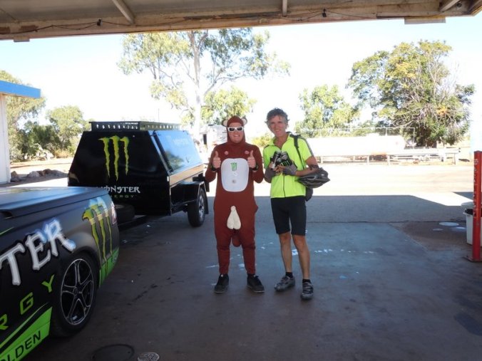 We stopped at Three-Ways, a somewhat famous roadhouse in the NT that is at the intersection of the Barkly Hwy and the Stuart Hwy. We had lunch (egg and bacon rolls for us, steak sandwich for Steve, his safe touring option). While we were there a promotion car for Monster Energy drink came through with some funny guys – we got some free drinks and they posed for a picture.