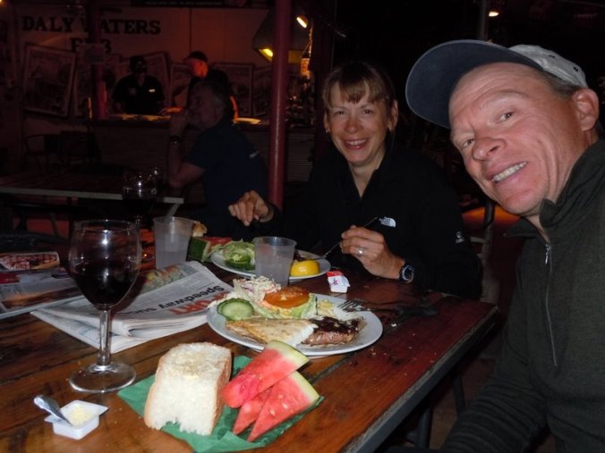 We arrived at the Hi-Way Inn, located at the intersection of the Carpentaria Hwy and the Stuart Hwy, about 11. From there we knew it was less than 10k to Daly Waters so we stopped to have a bite to eat. They had pancakes on the menu so that hit the spot. We finally put ourselves back on the bikes and rode the last 10k to the Daly Waters Pub, which has a caravan park (of sorts) attached to it. I say ‘of sorts’ because there is no camp kitchen at all – I think they expect you to eat in the pub or in your full service caravan!
