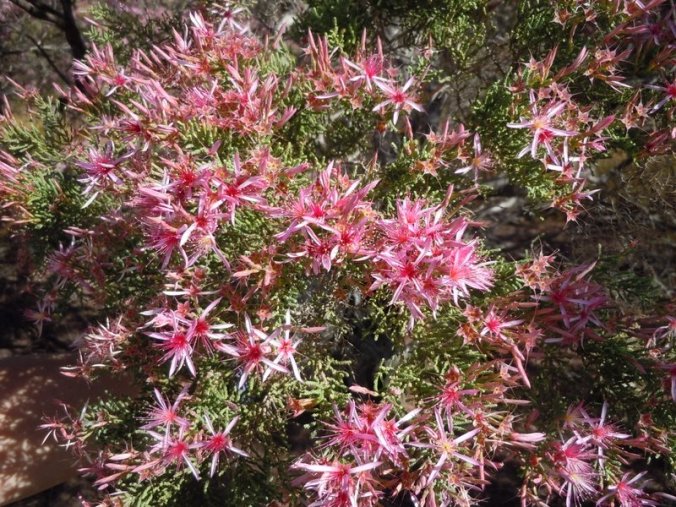 I couldn’t resist diving in my native plant books, it seems the pink shrub/ tree may be a calytrix.