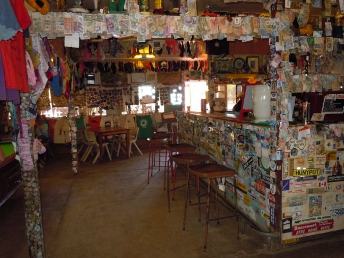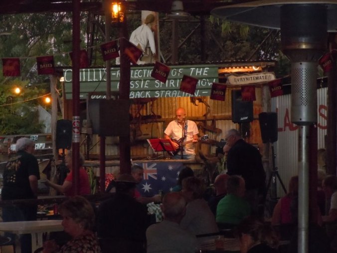 The pub is quite an interesting place – full of memorabilia stapled to the walls and ceilings. They have nightly entertainment. It is quite kitschy and touristy but fun too. We had the ‘beef and barra’ special for dinner – which came with the salad bar full of all kinds of different salads, as much damper bread as you wanted and watermelon for dessert. We had a lot of food – filled up the calorie deficit of the last couple of days, that’s for sure. The first entertainer was a guy singing 60s songs to pre-recorded tracks. Now there is a comic/singer up on the stage – we are back in our tent but can hear him as clear as if we were sitting right in the pub. I think it only goes until about 9pm so hopefully we will get some sleep soon…
