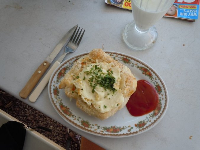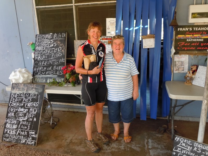 We didn’t have much to eat other than a couple bars and were getting hungry as we approached Larrimah. There were several signs calling out “Fran’s Pies and Scones”. Being a little hungry is not the way to avoid such temptation. We called in at Fran’s and found one of the best lamb pies we’ve ever eaten. We were the only guests so we got a full dose of Fran and her version of local history as well. All and all a great stop and find – not so secret as Fran claims that she is in one of the Lonely Planet guides.