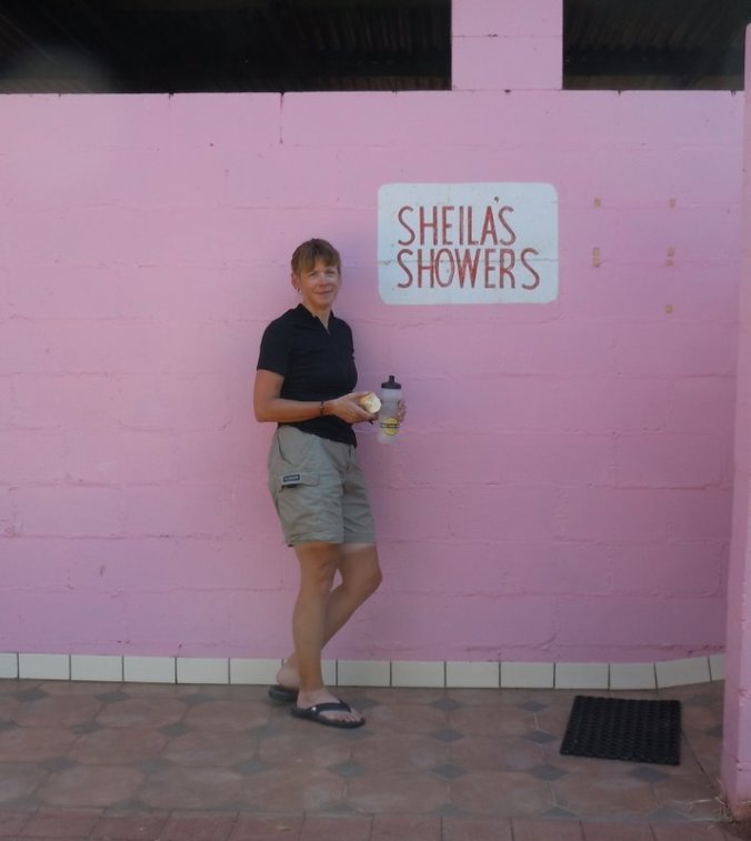 Interesting night in the camp overnight. The crew watching the big show in the pub came back in various states of inebriation. The nice quiet couple camped next us, whom looked quite innocent in the afternoon were really hooting it up – the wife making a very loud phone call just outside our tent and the husband later relieving himself in the grass next to our tent. They were both very quiet this morning. Funny, I would never have picked them as rebel rousers. They pulled in covered in red dust so they must have still had their bush camping manners in use.