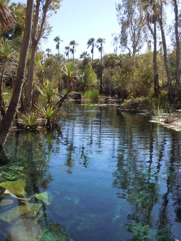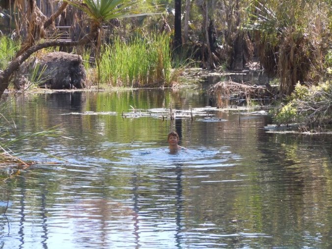 We rode our bikes about 2.5k down the road to the Bitter Springs thermal pools that are in the Elsey National Park. The springs are quite nice – warm, but not too warm. It was a beautiful little area with pools of warm water surrounded by trees. The pools are relatively deep and have been left in a natural state – they have not been modified other than to add a couple of steps that allow you to walk into them. There were not too many people there when we arrived so it was very quiet. Thank goodness there weren’t too many people to see our very weird tans!
