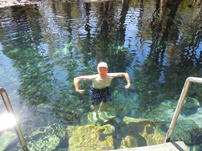 We floated around a bit – Dave managed to move away from the stairs and railings just a bit so that is progress. You could actually flow with the current around the springs and down to another landing point, but then had to walk back to the entry point. I swam up a little bit, but it was a little bit disconcerting to be the only person in the pool area at the time – everyone says there are no crocodiles there, that they would close it off if there were any crocodiles, but that usually only happens once the croc takes its first victim and I didn’t want to the be the first in that competition!