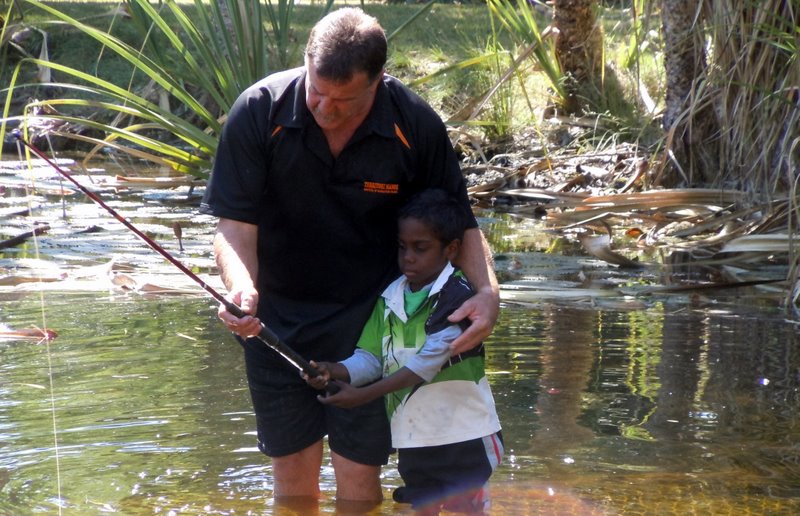 The campground has its own pond with barramundi that are fed twice a day. The fellow who feeds them gives a little talk about the fish and then puts some bait on a pole to feed the fish. It was actually quite fun, as there was a group of school kids, mostly aboriginal, who were on a school outing that had lunch at the cafe and were then going to watch the feeding. They had each gotten awards for their good attendance at school, and the little fellow with the highest attendance (99%) also got to feed the barramundi.  Barramundi are apparently all born male, and those that make it to the sea turn female after they have been in the sea for a period of time. They are pretty quick fish and sure seem to know how to get the bait off the line – they seem to get the bait before you could even see that they were moving.