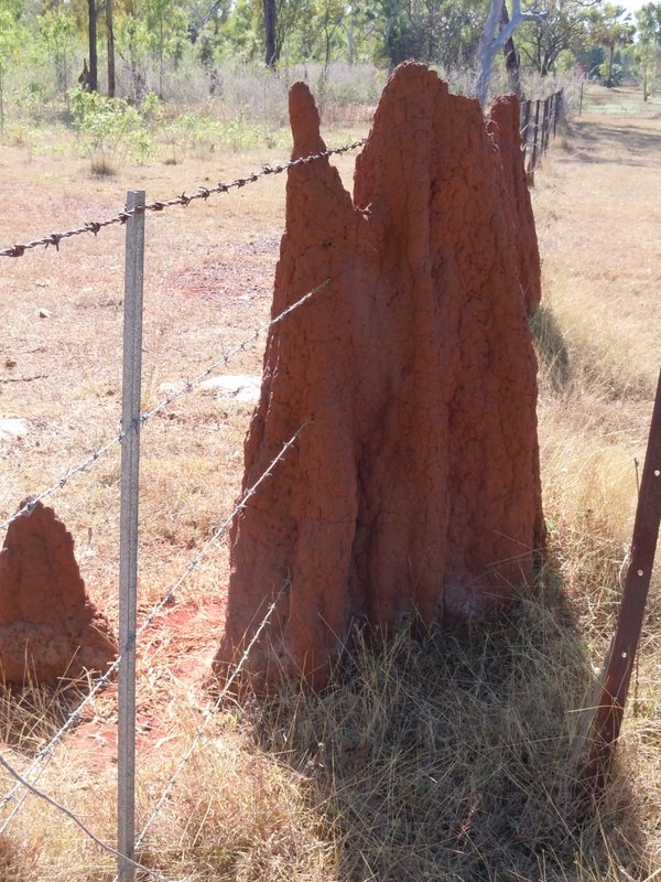 Anyway, we spent about an hour floating around (avoiding crocs and snakes) and then rode back to camp. On the way back we stopped to take a picture of some of the termite mounds that have grown up around the fences – right around the barbed wire and even some of the posts. There were houses that had multiple termite mounds in the yards – I guess you just get used to them!