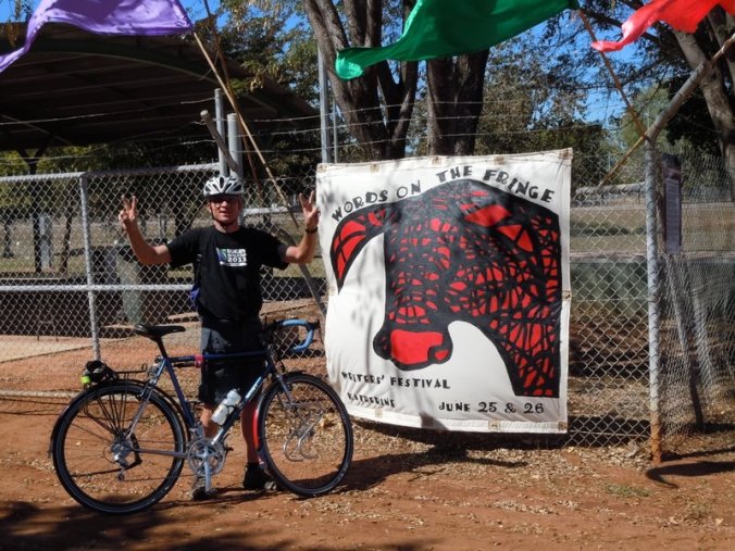 We had another day in Katherine today – this was a more typical rest day with cleaning bikes, laundry and making a plan for the next few days/weeks. In the afternoon we made one last trip the grocery store and coffee shop. The Fringe Festival was still going on today but by the time we got out of camp, it was pretty much over. Nancy still got my photo in front of the festival banner. I felt a sudden rush of “hippy” posing but had regrets that I had not started growing my hair out sooner than 6 weeks ago. A tie-dyed shirt would not have gone a stray either.