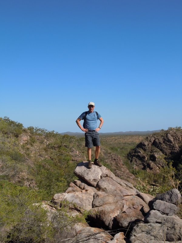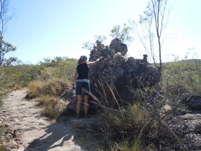 From here, we hiked up the escarpment to upper Edith Falls. There were some great views out over the distant mountains and another chance or two for Nancy to work on her rock piling skills. There are several pools and lots of levels of falls. If someone had told you that it was a Disney set, you would have believed them. Lots of people about (some trying to prove how stupid people can be climbing over cliffs in speedos and string bikinis). But it didn’t feel crowded as it was easy to move to the next pool or a quite area in the bigger pools. We had a wade about and headed back to camp via the shorter path. There were lots of cars in the day use area – either today was a lot busier or we just missed them yesterday after riding in.