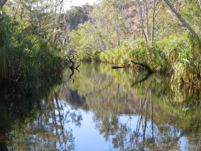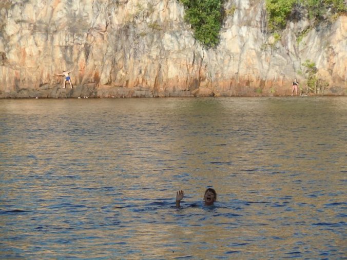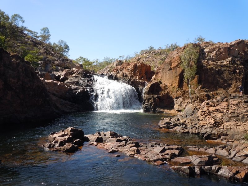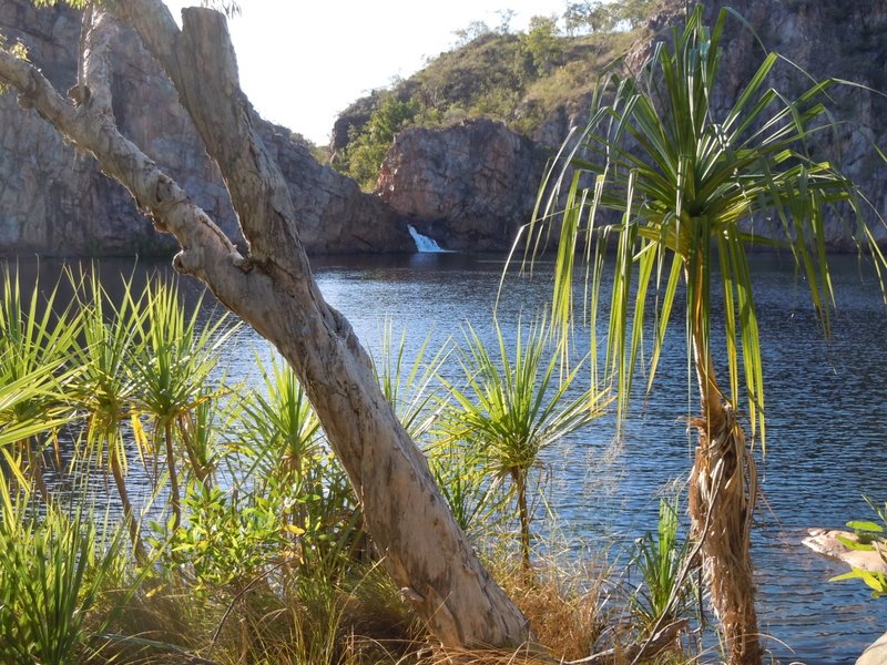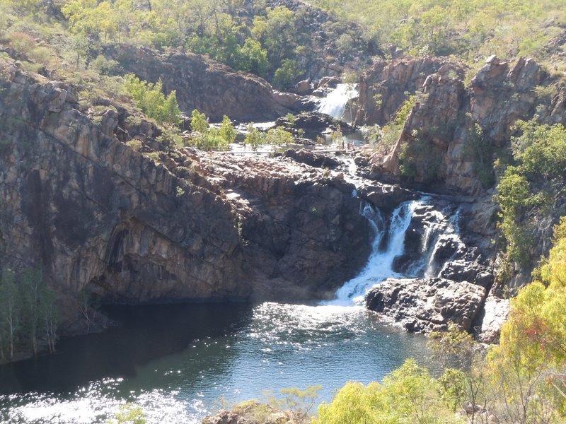 Having decided to spend the day here at Edith Falls, we were in no hurry to get up this morning. Still, with all the birds, we didn’t sleep much past 7:30. Technically it is a rest day, but we did not have a big pile of fresh food (there is none here) so it was oatmeal and coffee for brekkie. Eventually we got motivated to go on a bushwalk to the lower Edith Falls pool, then on to upper Edith Falls. They are quite spectacular. The lower falls is not much in way of falls but a pretty good sized lake. Very surprising to walk the 200 meters from camp and see it. We’ve seen a lot of desert out here and to find such an oasis was not expected – guess we should have come down yesterday.
