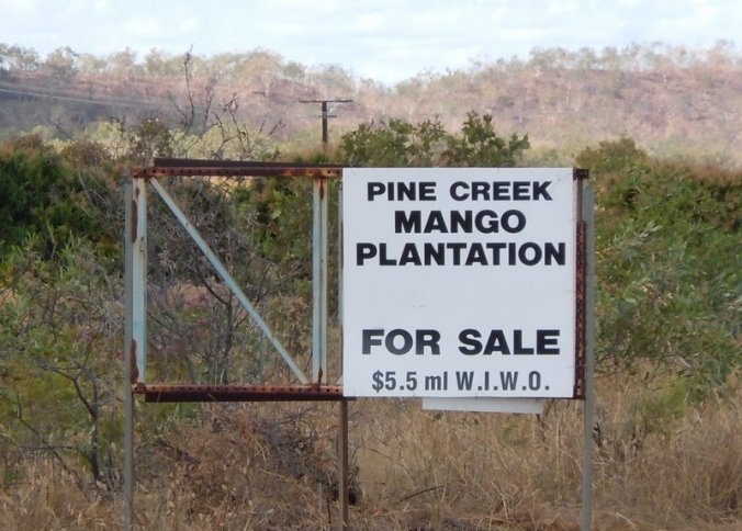 Back on the Stuart Highway, we had a lot more traffic than we remembered from two days ago. Perhaps it was Friday and everyone was looking to be somewhere for the weekend. Whatever the cause we felt a little on edge and rode more carefully – pulling off to the shoulder a few times when road trains approached and it didn’t seem safe. Still, we made good time to Pine Creek with the nice tailwind. Just at Pine Creek there were a number of roadside signs advertising a mango farm for sale. One actually pointed out that it would be the ideal purchase for “2 retired couples”. I’m not sure that buying a farm is really a retirement gig but I do like mangos. Anyone out there looking for a career change? Partnership perhaps, Northern Territory Mango farm?