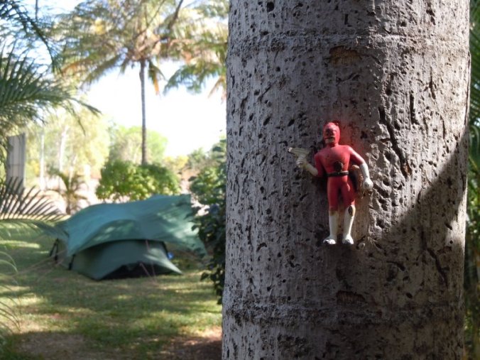 Midmorning I spotted Adventure Man’s brother on a tree near our site. You may remember that Adventure Man is my bicycle’s mojo – sitting proudly on my handlebar stem. I don’t know that AM’s brother is as proud of his home, protecting the camp kitchen – here he is with our site in the background.