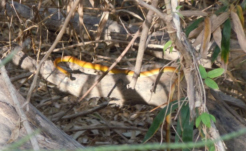 There is a linear park between the Adelaide River and the road leading to the cemetery. I walked down right on the edge of where the park was mowed. I hoped to get a view of the river or maybe see another bower bird nest. I was quite surprised to spot a bright yellow tree snake sunning on a log. He didn’t stick around long once I took the photo. I don’t know if this snake is poisonous. No, I did not pursue it into the undergrowth once it moved off the log.