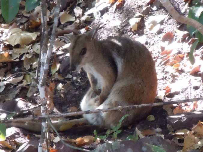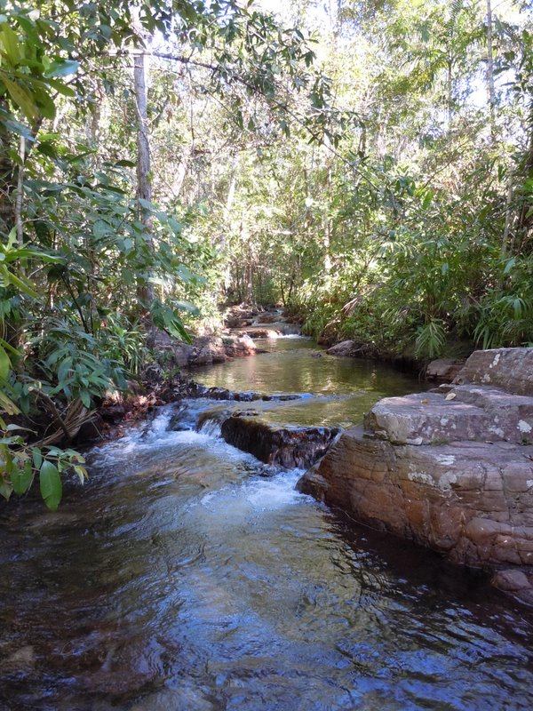 Florence Falls campground, our stop for the first night, is right near the actual falls. Ater setting up the tent, taking showers and having some lunch, we put on our swimsuits and headed over. The main falls are quite impressive. And so was the crowd at them. With a number of the other swimming holes closed because of crocs, this one was packed. We took some photos and headed upstream where we found a couple very small, almost private pools. They were not very deep but they were empty and above the hoards at the main pool. We had a nice dip and chilled nicely from the day’s heat. From here we went on a big loop walk up one stream bed and down another. It was only a couple K in length but it was quite nice, mostly rain forest and stream crossing. There were a surprising number of completely dry ferns – I later learned that this one particular fern is supposed to go completely dry during the dry season. I took lots of photos of the various pools – a very nice way to spend the afternoon.