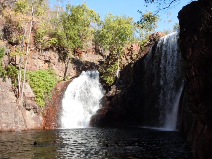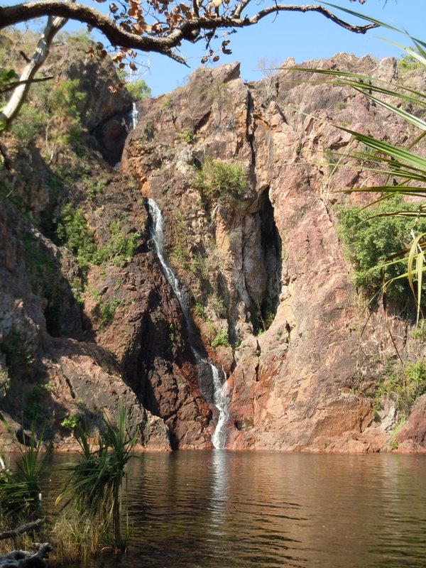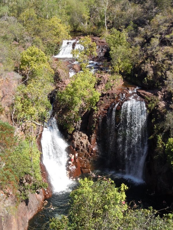 Next stop was Tolmer Falls – another short drive off the main road. By now, the cars and buses were starting to arrive and the parking lot was filling up. The walk down to the falls pretty long but the view was nice. Nancy didn’t walk down as one of us had to stay with the bikes. She stayed back and talked to a bunch of other visitors – you can’t help but attract attention on touring bikes. I offered to watch the bikes but we ended up just chatting more and then headed off. From Tolmer Falls it was about 10k to Wangi Falls. We arrived in time to get “site ownership”. The sites here are further apart and the facilities generally better. There are fewer folks because they have closed the swimming due to a croc (a big fat one) being caught not too long ago.