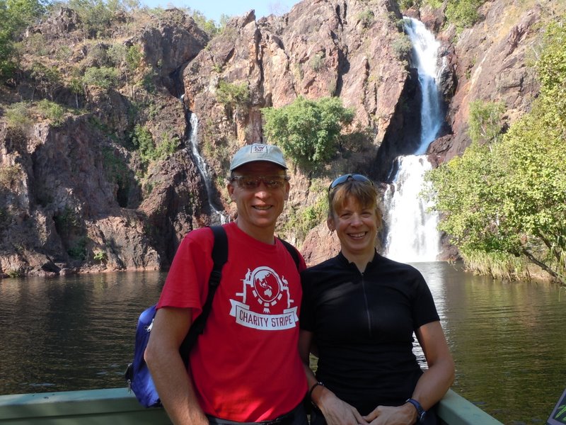 We were up the following morning pretty early. We had to ride back into Batchelor for supplies before we rode the 48k to the campsite at Florence Falls but we heard that the campsites in the national park fill up early. That turned out to be a good plan as later that day each of the campsites at Florence Falls had 2, 3 and 4 different groups per site. Because we got to Florence Falls about noon we had “owner’s rights” on our site, one of the last vacant sites. This let us decide who we shared with – we picked a family from Belgium who were just starting their tour of the Northern Territory. Some sites filled up with lots of “20-somethings in vans” – not that we aren’t hip, but all night guitar sessions don’t work so good when you are cycling.