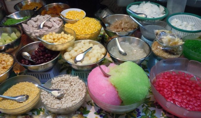 Since it’s hard to post photos of where we might go, I thought I’d post a photo I took at the night market tonight. We went to the night market for dinner and had a great Thai curry and a Pad Thai. We did not have dessert but I could not pass up the chance to photograph the dessert topping cart. If you look closely at the photo below you will see the following dessert toppings: