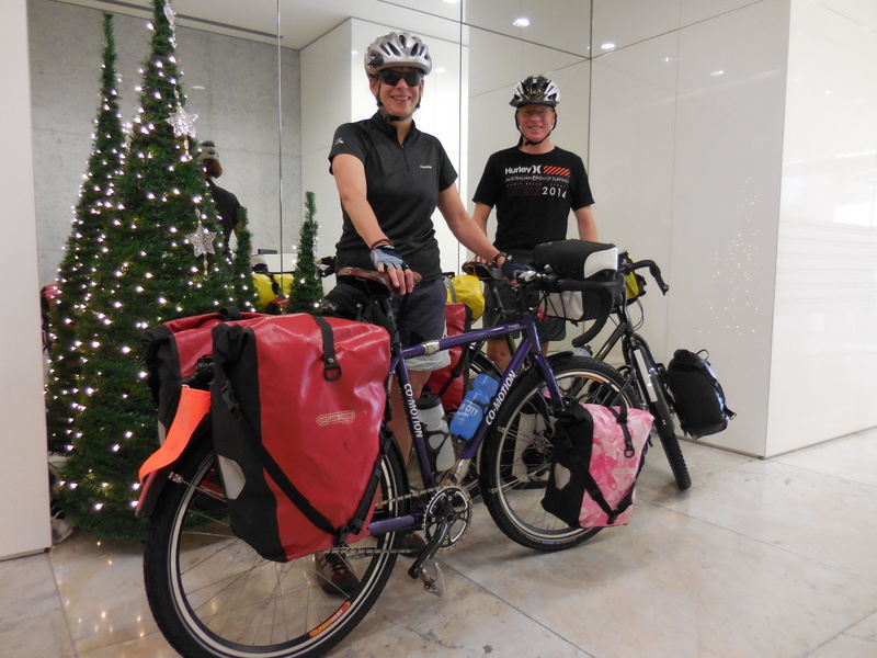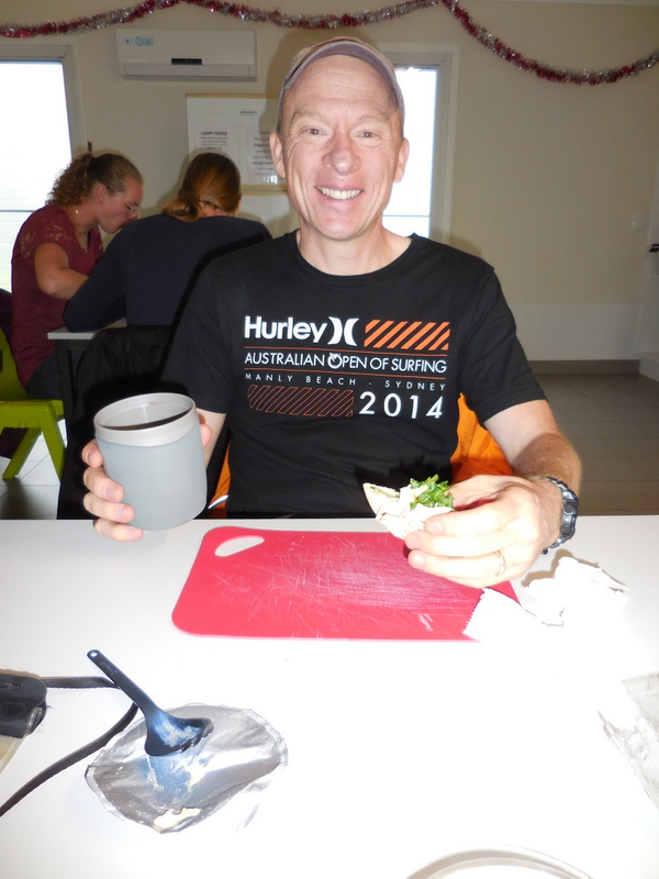 Anyway – the tent is up.  We’ve had a first day glass of wine, Aussie lamb patties for dinner, Christmas pudding for dessert and stress levels are remarkably lower.  Tonight we get to try out our new Nemo Duo-Tango sleeping bag (in our small but lovely tent).  Tomorrow is Xmas and we won’t be with friends and families.  But we do get to ride our bikes (a lot further than today) and I’m sure that the fog will lift (and the rain, which has just started dumping down, will stop).  Who knows, maybe the tent will seem bigger once we get settled in for the night.  Merry Christmas everyone!