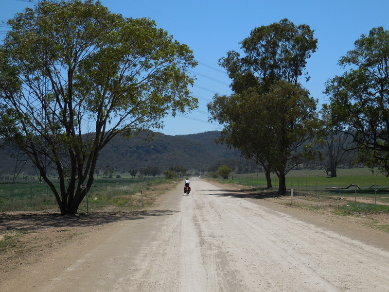 We stopped at Wollar store for a drink and a sausage roll, knowing it would be our last store for the day until we reached Bylong. The road climbed a bit out of Wollar, and we finally hit the dirt road that we had been anticipating. However, it wasn’t quite the road we had anticipated – it was silky smooth, we were going 28-30kh without any issues. So, not your usual dirt road. We had 7k of this dirt road with a bit of paved sections thrown in, and then we came up on some road works, which explained the road surface – they were obviously getting ready to pave it. Unfortunately, these guys were at the end of the road works, so from there on it was your usual dirt road – washboard, rocky and bumpy, which meant much slower. But, all in all, not as bad as it could have been, as we were riding through a very pretty valley with farms dotted about.