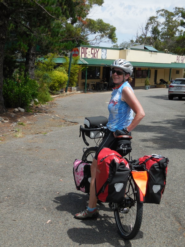 For some reason, the ride down Peats Ridge was easier than either of us remembered.  It could have been the sausage rolls.  Before long we were at another favour cafe stop at Mt White.  We were stopping now every 20k or so just to make sure that we had enough cold liquids.  Nancy was dreading the rolling hills before the Mt White decent but they were also “not too bad”.  Before we knew it, we were at the Brooklyn climb and I had Nancy in Plan B mode.  She had been talking all day about how hard the Brooklyn climb would be (Chief Editor’s note – a bit of an exaggeration, I simply noted that if the sun was at full strength with no cloud cover it was going to be bloody hot!) but it turned out to be ok – we had a few clouds and in many ways a long sustained climb is easier than the rolling terrain of earlier in the day.  We pulled over at Pie in the Sky for a pie (what else) and a little congratulations.  Little did we know that the pie would provide the extra energy we needed to get all the way home.