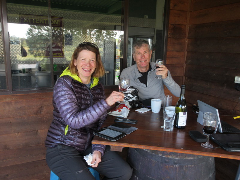 For lunch we hopped on the bikes and rode 5k out to Petersons House for a lovely vineyard side lunch. They were booked out for formal seating but it worked out better for us sitting on the tables in their big lawn. I don’t think the folks in the restaurant proper would have appreciated our sweaty bodies, nor the clomping of our cycling shoes. Petersons is famous for their sparking but we managed to find a nice red from their sister vineyard called Lambloch. Being sensible adults, we didn’t finish off the full bottle until we got back to the YHA – safety before wine as they say.